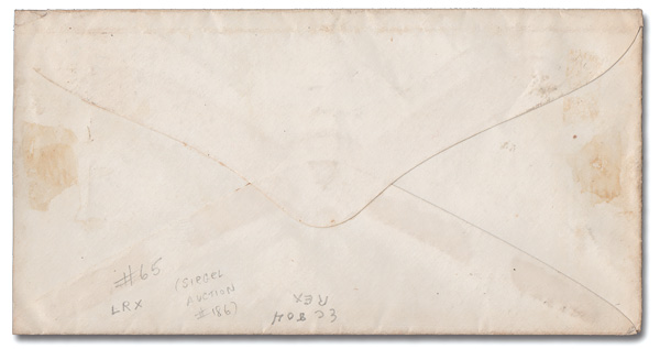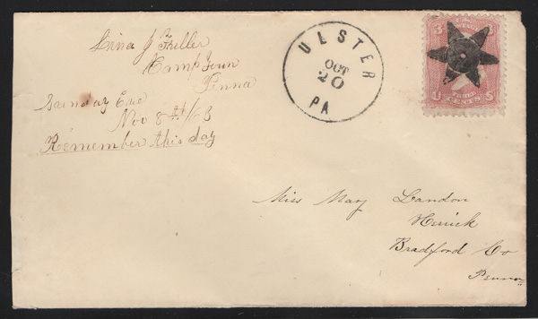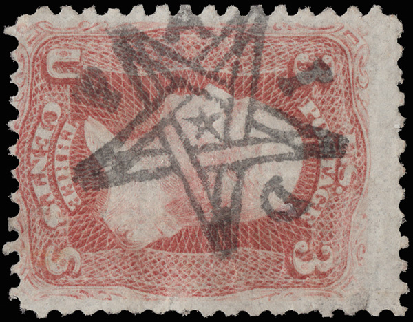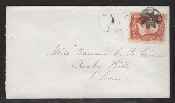 pen-canceled 3¢ rose (65) on a small cover to Andes, N.Y.; illegible town cancel. Very uncommon in in red. (Image) (Image2)