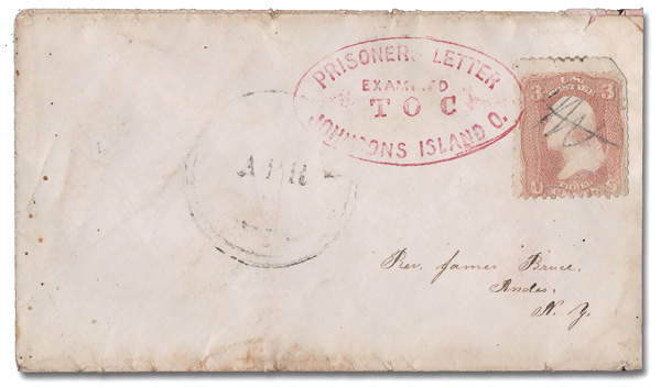 <"PRISONERS LETTER/JOHNSONS ISLAND O.", red oval with "EXAMINED/T O C" ties a