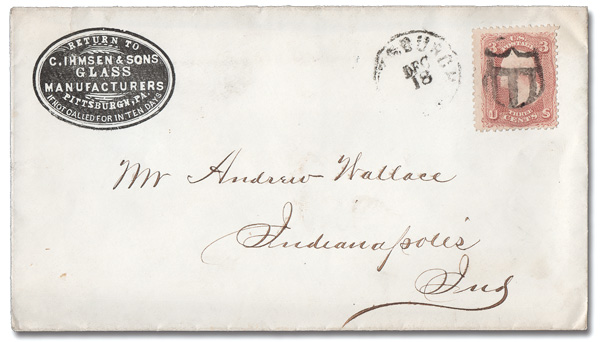 on a 3¢ rose (65) (not tied) alongside a partial Dec 18 Pittsburgh c.d.s. on a cameo-style advertising cover for C. Ihmsen & Sons Glass Manufacturers; top flap missing. (Image) (Image2)