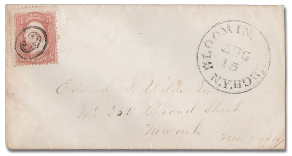 tied) on a cover to Newark, N.J., postmarked with a mostly clear Aug 15 Bloomingburgh c.d.s. (Image) (Image2)