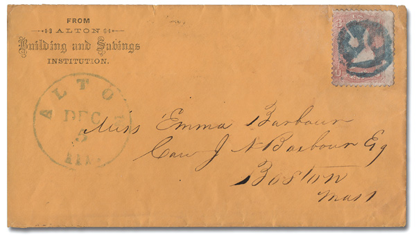 (not tied) on a cover to Boston, Mass.; postmarked with a matching Dec 5 Alton c.d.s. and bearing an Alton Building and Savings Institution corner card. (Image) (Image2)