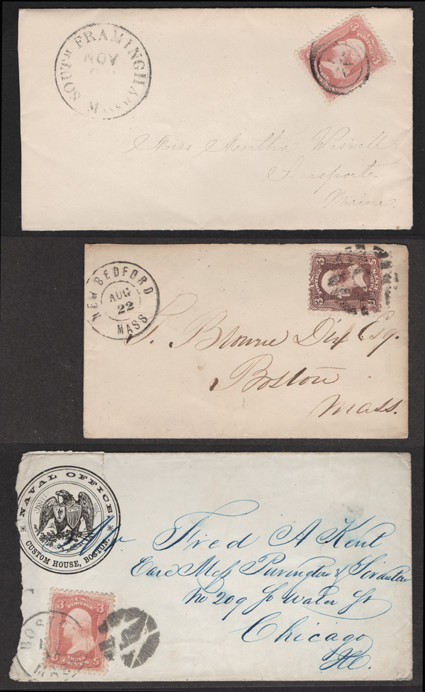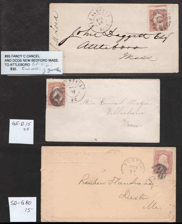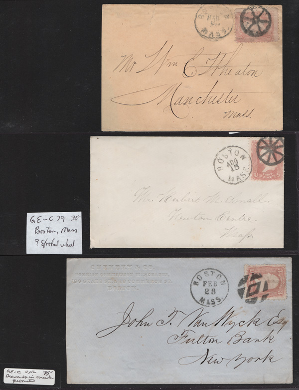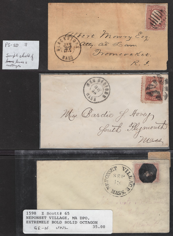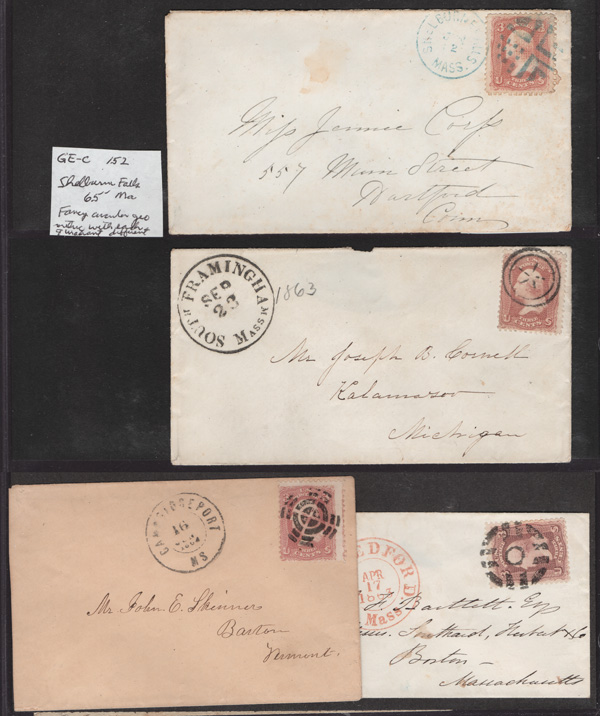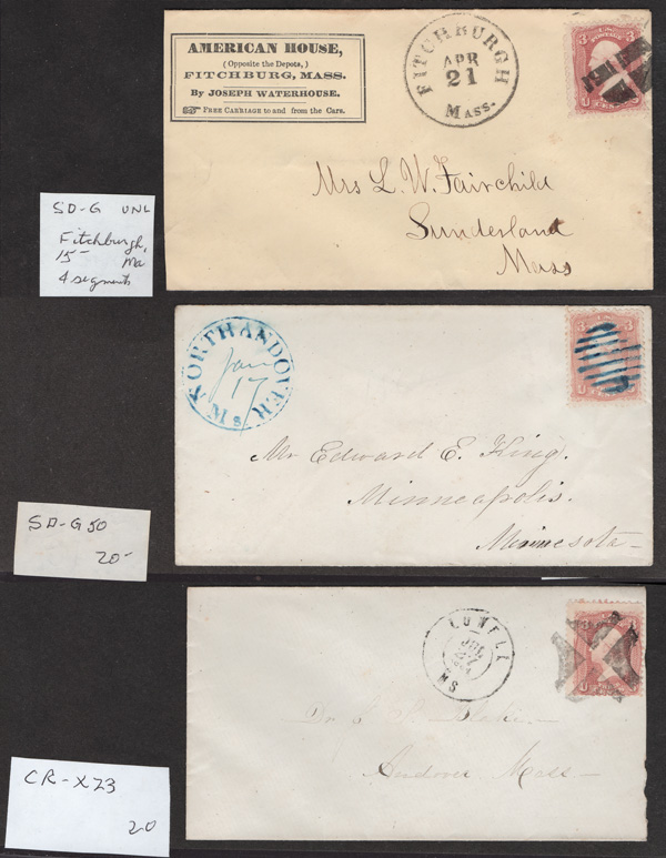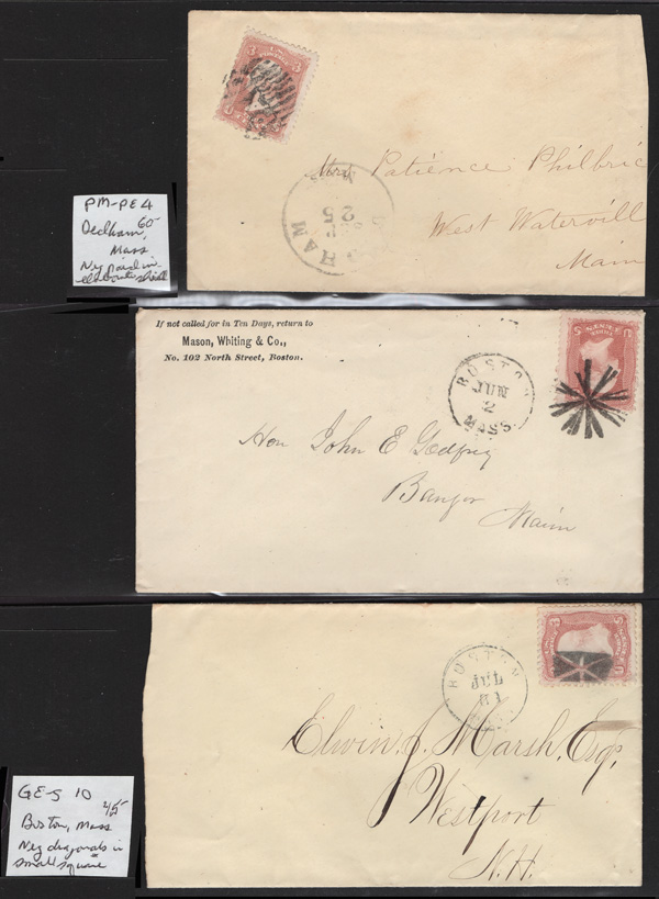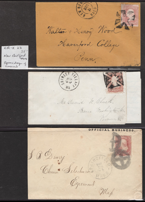 Geometric Cancels of Massachusetts on 3¢ 1861s, 25 covers on 3-row, 2-sided stocksheets; six are Boston; mostly nice