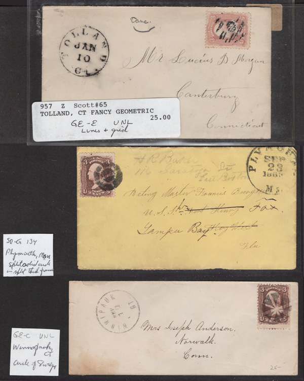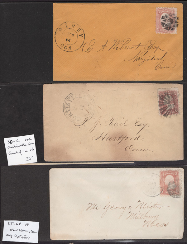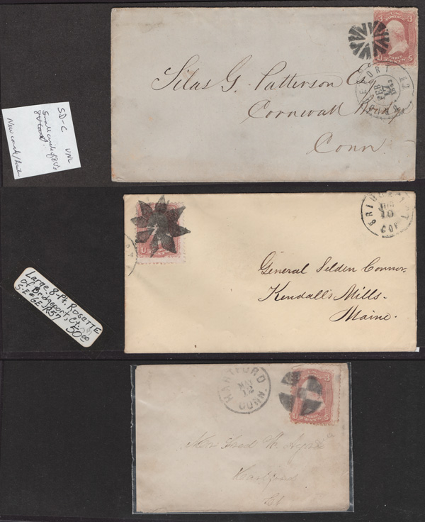 Geometric Cancels of Connecticut on 3¢ 1861s, 16 covers on 3-row, 2-sided stocksheets; includes a red paint