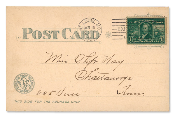 6030 cover 323 image1904, 1¢ Louisiana Purchase (Scott 323), clean example of the souvenir post card of the 1904 World's Fair, Extremely Fine.