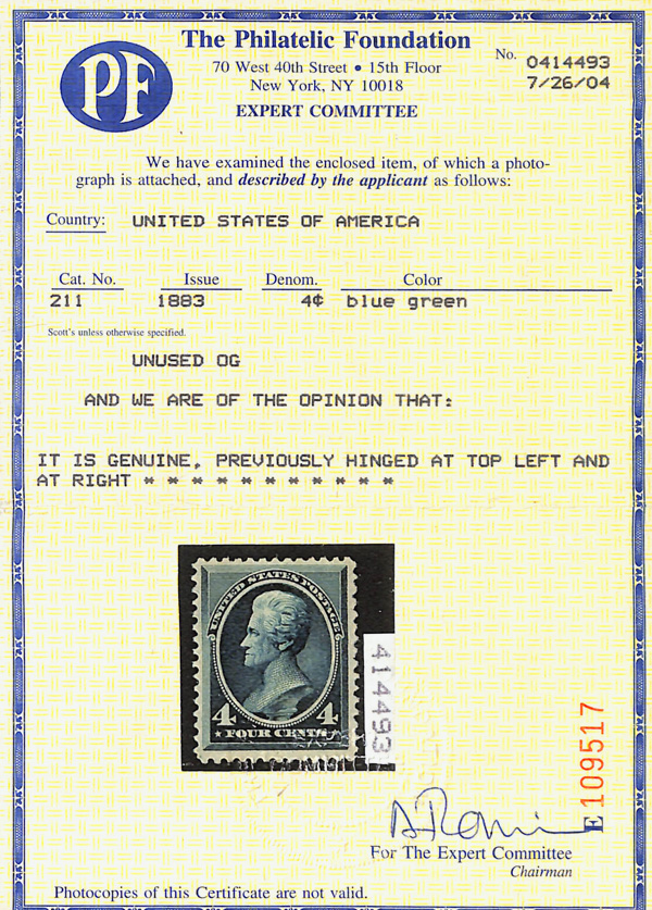 6008 og 211 image1883, 4¢ blue green (Scott 211), o.g., very lightly hinged, Fine to Very Fine, with 2004 P.F. certificate.