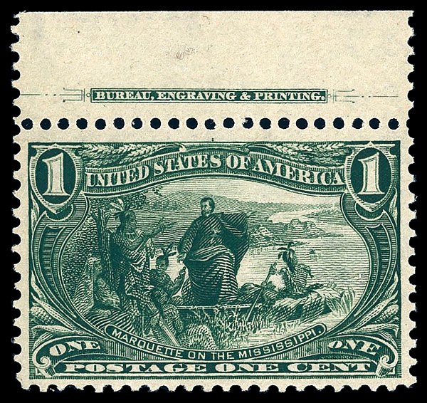 6028 nh 323 image1904, 1¢ Louisiana Purchase (Scott 323), top margin plate number and part imprint pair, clean example with "Bureau, Engraving & Printing." inscription & plate number 2130, o.g., never hinged (small spot on gum), Very Fine to Extremely Fine. (Image) Suggested Bid $50