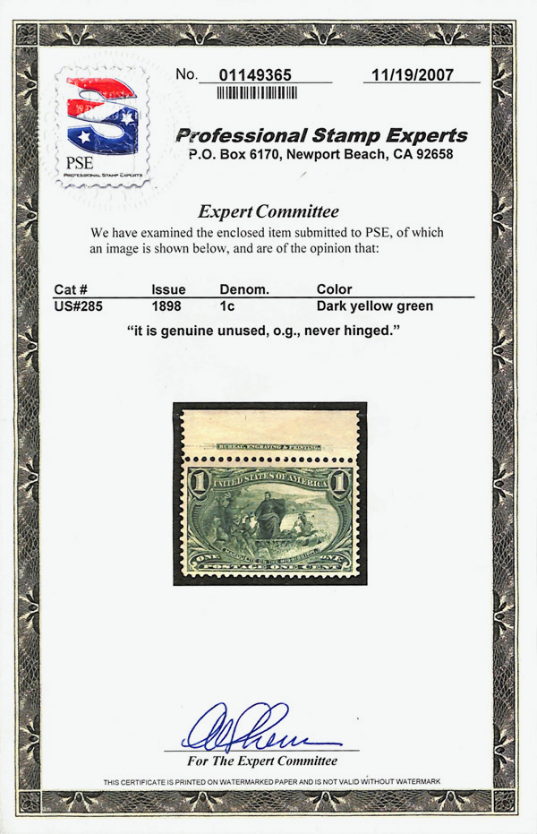 6019 nh 285 image1898, 1¢ Trans-Miss. (Scott 285), single with imprint, o.g., never hinged, Very Fine, with 2007 P.S.E. certificate.