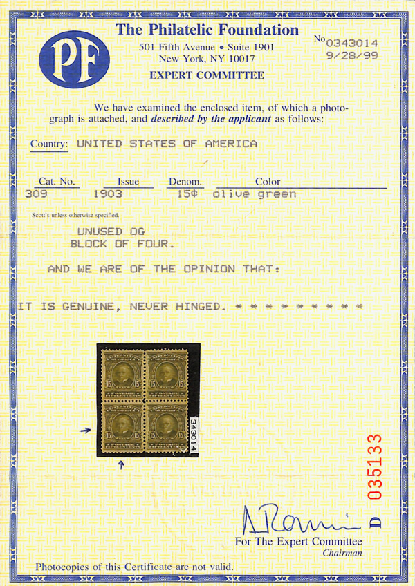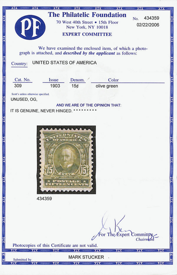 6025 nh 309 image1903, 15¢ olive green (Scott 309), o.g., never hinged, Very Fine, with 2006 P.F. certificate & 1999 P.F. certificate.