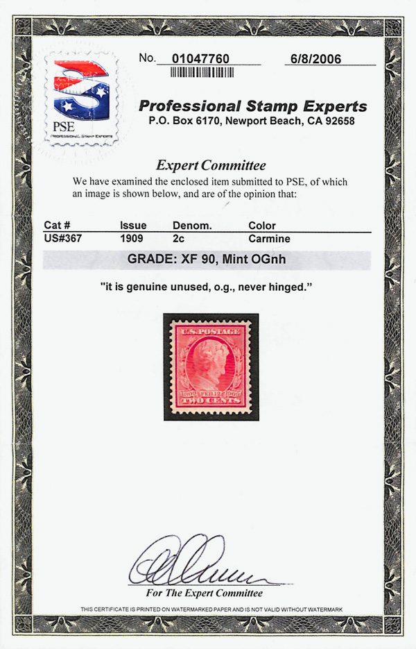 6033 nh 367 image1909, 2¢ Lincoln (Scott 367), o.g., never hinged, Extremely Fine, with 2006 P.S.E. certificate graded XF 90.
