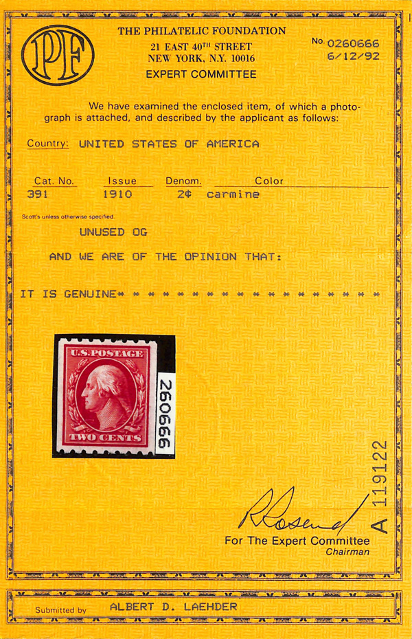6036 nh 391 image1910, 2¢ carmine, S.L. watermark, coil, perf. 8½ horizontally (Scott 391), o.g., never hinged, Very Fine, with 1992 P.F. certificate.