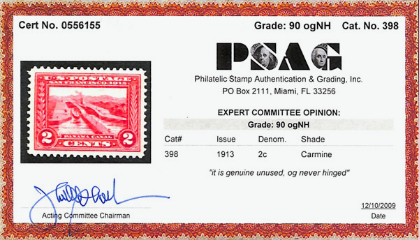 6038 nh 398 image1913, 2¢ Panama-Pacific, perf. 12 (Scott 398), o.g., never hinged, Extremely Fine, with 2009 P.S.A.G. certificate graded XF 90.