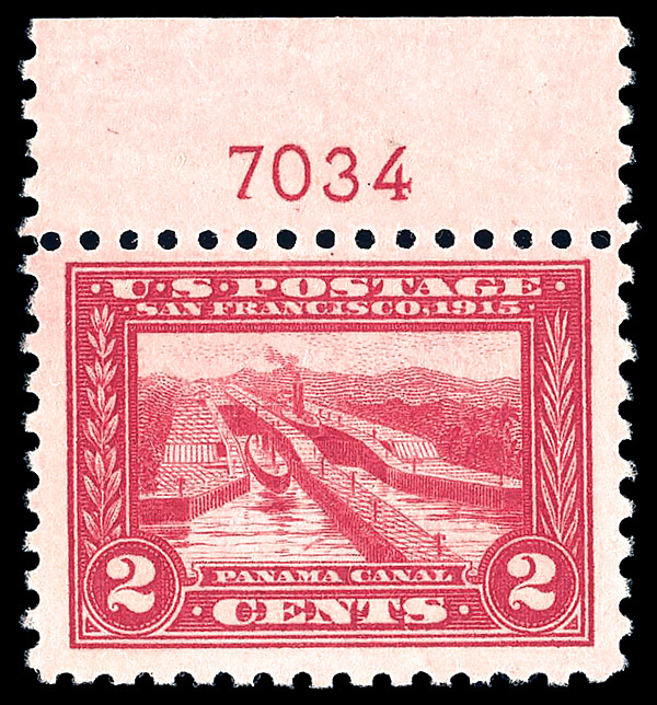 6040 nh 402 image1915, 2¢ Panama-Pacific, perf. 10 (Scott 402), plate number single, o.g., never hinged, Very Fine.