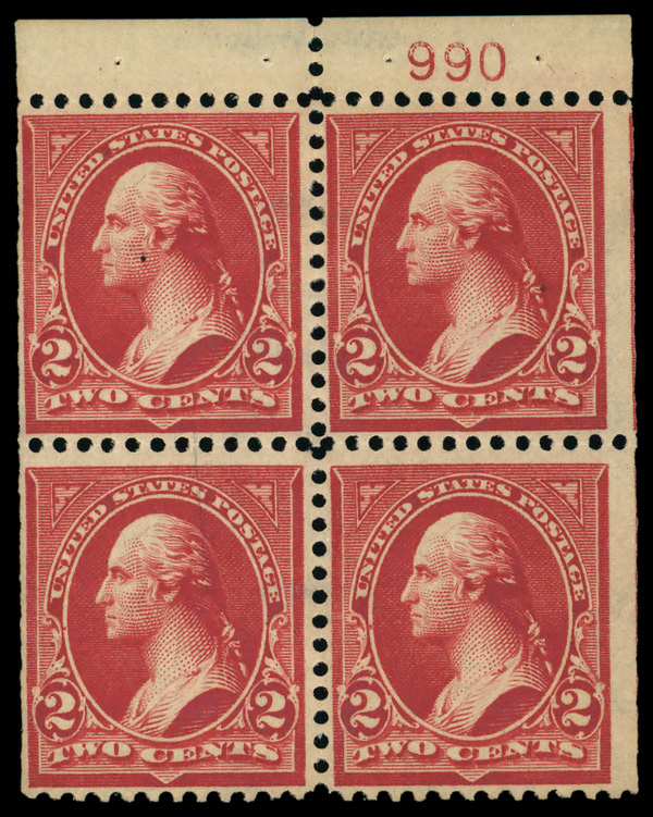 6018 nh/og 279B image1898, 2¢ red, type IV (Scott 279B), block of 4 from booklet pane with plate number, o.g., lightly hinged (2 stamps never hinged), Fine to Very Fine.