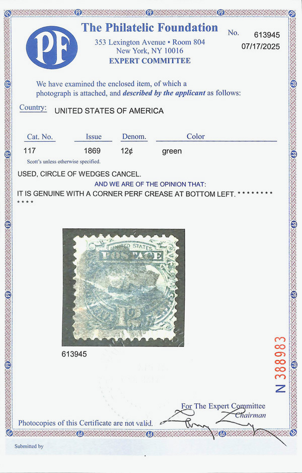 6006 O 117 image1869, 12¢ green (Scott 117); corner perf crease LL, Very Good to Fine, with 2025 P.F. certificate.