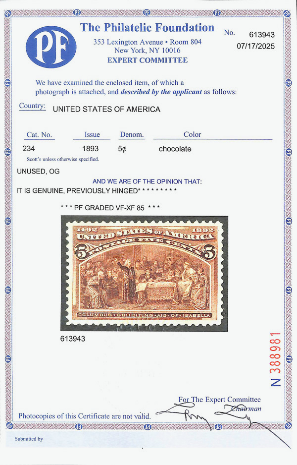 6013 og 234 image1893, 5¢ Columbian (Scott 234), o.g., very lightly hinged, Very Fine to Extremely Fine, with 2025 P.F. certificate graded VF-XF 85.