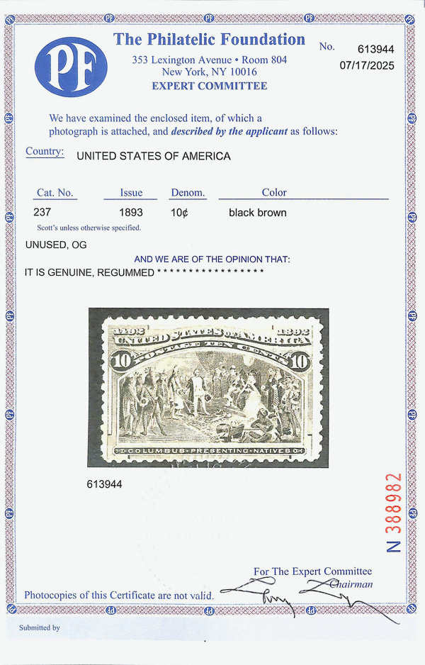 6014 ng 237 image1893, 10¢ Columbian (Scott 237), regummed, Fine, with 2025 P.F. certificate.