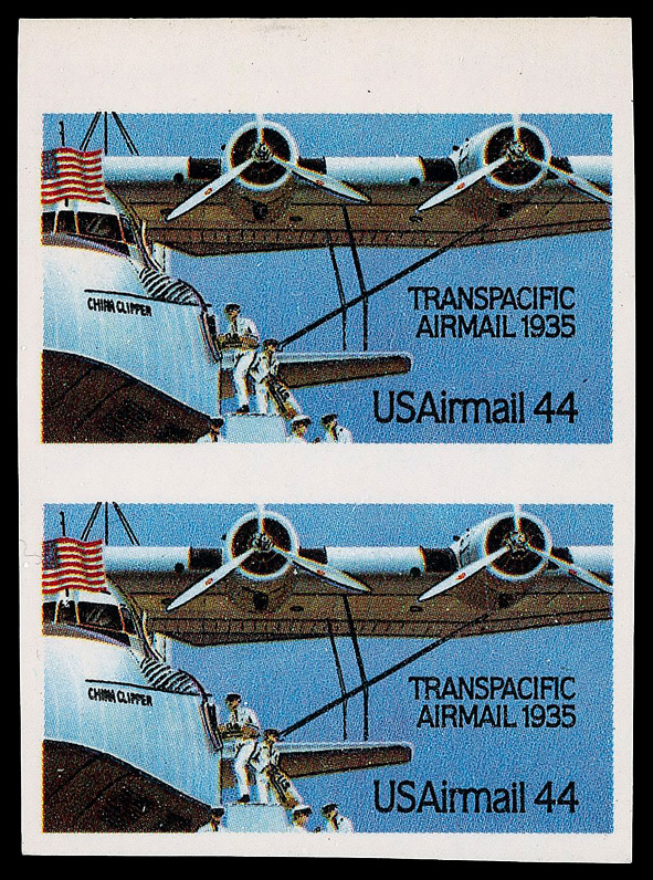 6442 nh C115a imageAirmail, 1985, 44¢ Transpacific, imperf. pair (Scott C115a), Post office fresh with good centering sharp colors and crisp lines, o.g., never hinged (faint fingerprint on gum), Very Fine to Extremely Fine, only 50 pairs issued.