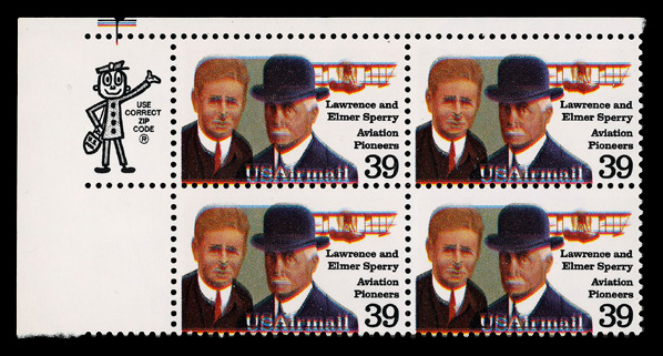 6441 nhbl C114 var. imageAirmail, 1985, 39¢ Sperry & Elmer (Scott C114 var.), top left block of 4, this color shift presents a very dramatic "blurring" in the design, o.g., never hinged, Very Fine to Extremely Fine. (Image) Suggested Bid $75