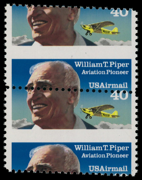 6445 nh C129 var. imageAirmail, 1991, 40¢ Piper, A.B.N.C. printing, misperforation (Scott C129 var.), pair, stunning visuals and color misperfed horizontally, o.g., never hinged, Very Fine to Extremely Fine. (Image) Suggested Bid $74