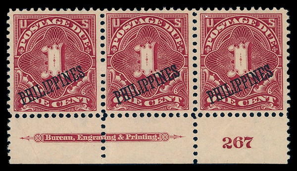 6478 og J1 imagePostage Due, 1899, 1¢ deep claret (Scott J1), plate number strip of 3, o.g., lightly hinged, Very Fine to Extremely Fine.