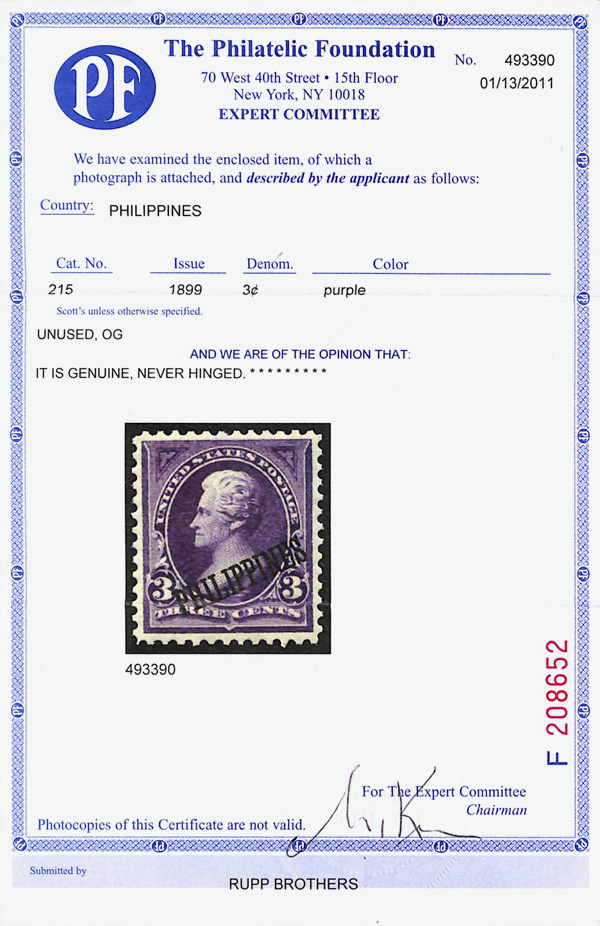 6471 nh 215 image1899, 3¢ purple (Scott 215), o.g., never hinged, Extremely Fine, with 2011 P.F. certificate.