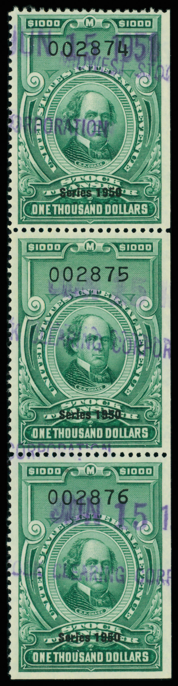 6217 O RD335 imageStock Transfer, 1950, $1,000 Chase (Scott RD335), vertical strip of 3, Very Fine.