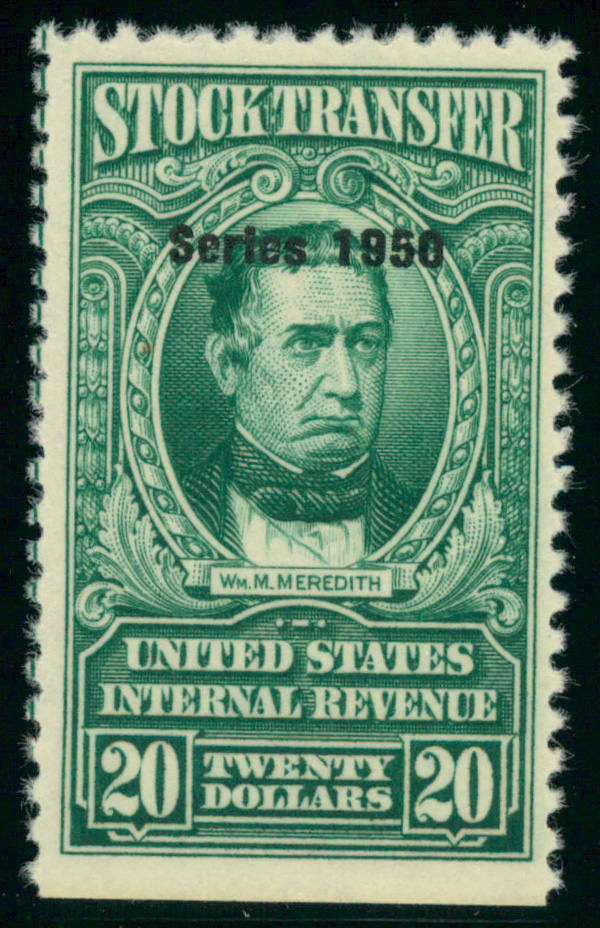 6216 ng RD329 imageStock Transfer, 1950, $20 Meredith (Scott RD329), unused without gum; straight edge at bottom, Very Fine.