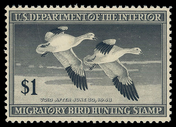 6230 nh RW14 imageFederal Duck Stamp, 1947, $1 Snow Geese (Scott RW14), o.g., never hinged, Very Fine.