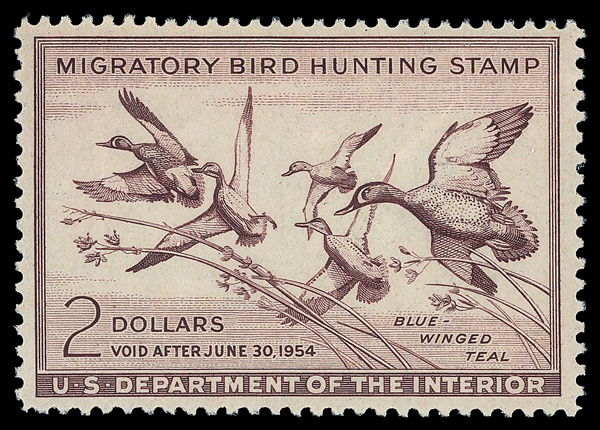 6236 nh RW20 imageFederal Duck Stamp, 1953, $2 Blue-winged Teals (Scott RW20), o.g., never hinged, Very Fine.