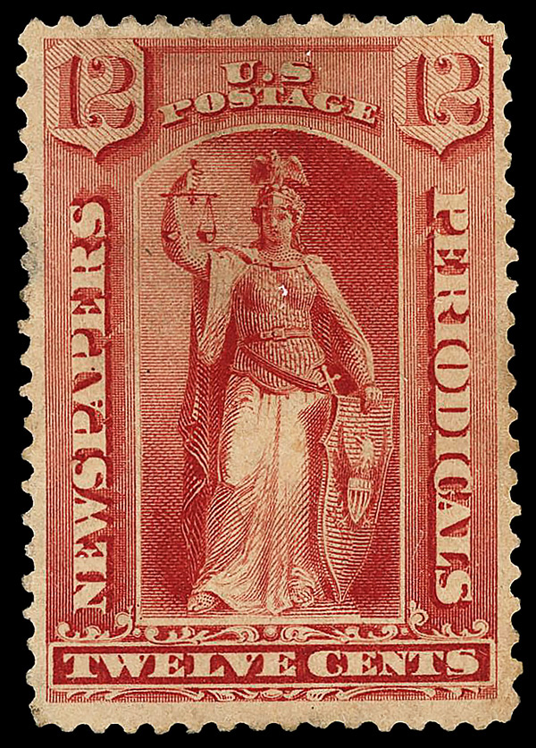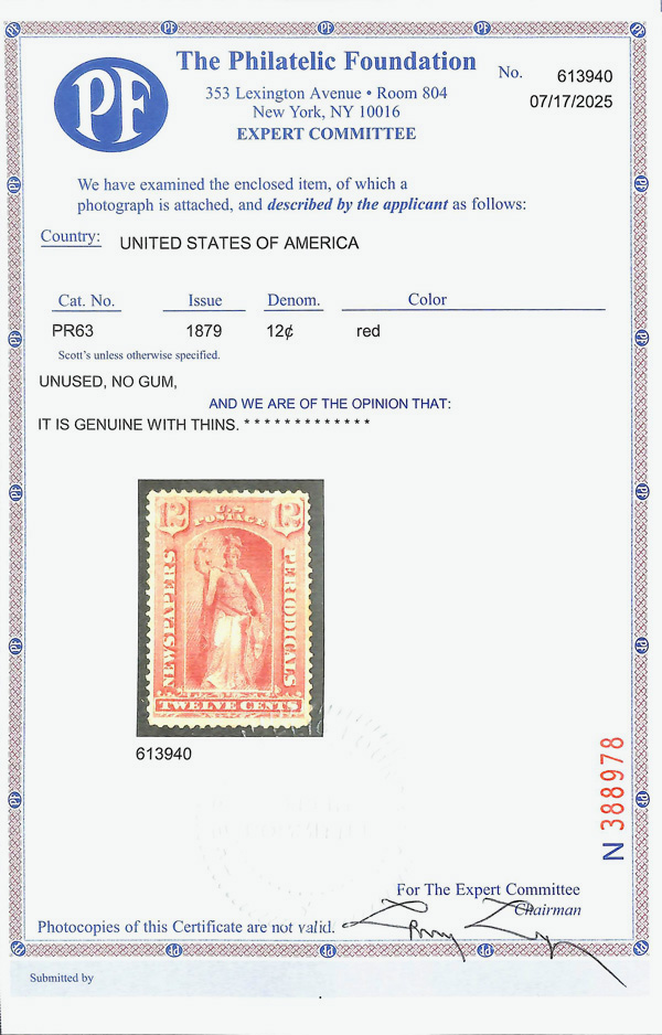 6207 ng PR63 imageNewspaper, 1879, 12¢ red, A.B.N.C. printing (Scott PR63), unused without gum; thins, Fine to Very Fine, with 2025 P.F. certificate.