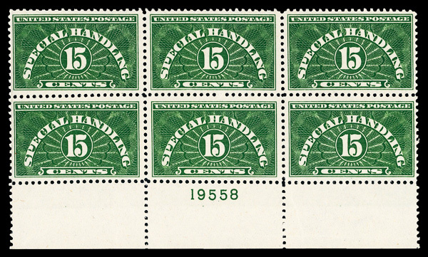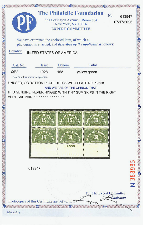 6210 nhbl QE2 imageSpecial Handling, 1928, 15¢ yellow green (Scott QE2), plate block of 6, o.g., never hinged (minor gum skips), Very Fine, with 2025 P.F. certificate.