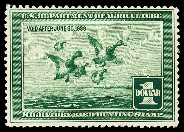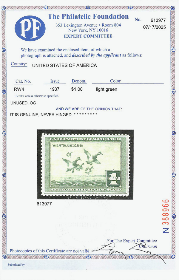6225 nh RW4 imageFederal Duck Stamp, 1937, $1 Scaup Ducks (Scott RW4), o.g., never hinged, Fine, with 2025 P.F. certificate.