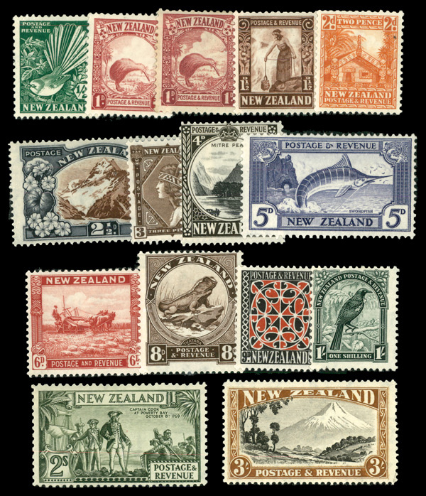 7451 og 185-198 image1935 Pictorials, ½d-3s complete (Scott 185-198), Single NZ & Star watermark, complete set of singles, o.g., lightly hinged, Fine to Very Fine.