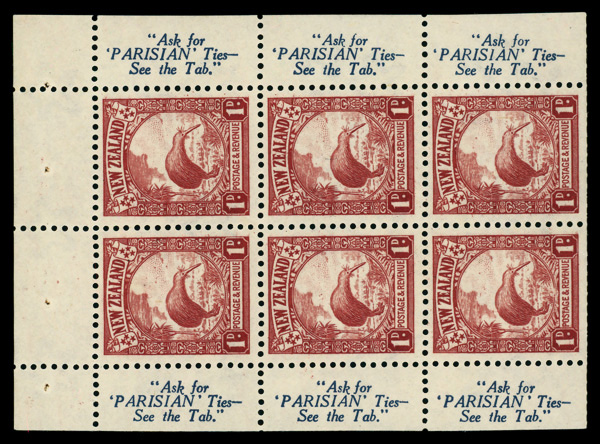 7452 BKog 186Ab image1935, Pictorial, 1d scarlet, Die II (Scott 186Ab), Single NZ & Star watermark, booklet pane of 6 with ad labels, o.g., lightly hinged, Very Fine.