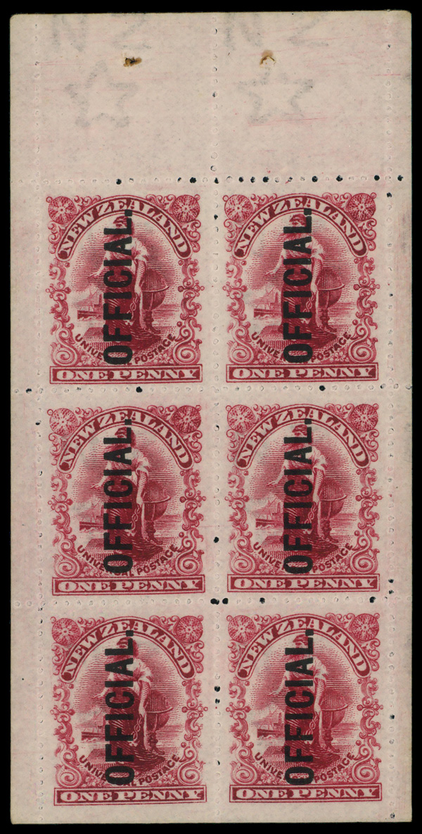 7462 BKnh O24a image1907, 1d carmine, 'OFFICIAL.' overprint (Scott O24a), booklet pane of 6, o.g., never hinged, Very Fine to Extremely Fine.