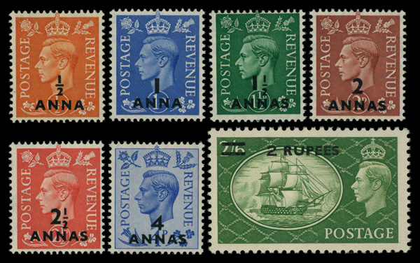 7464 nh 35-41 image1951, Great Britain King George VI ½a-2r surcharges, complete (Scott 35-41), set of 7, o.g., never hinged, Fine to Very Fine.