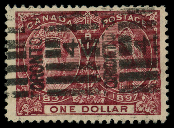 7490 O 61 image1897, Queen Victoria Jubilee, $1 lake (Scott 61), roller cancel; crease, Very Fine.