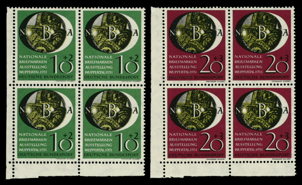 7737 nhbl B318-B319 image1951 Wuppertal complete (Scott B318-B319), corner margin blocks of 4, o.g., never hinged, Very Fine to Extremely Fine.
