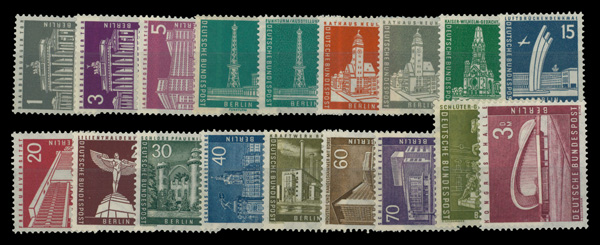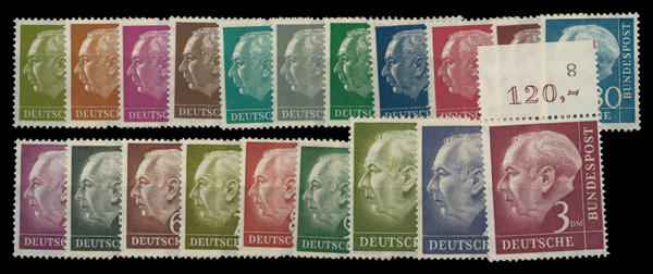 7728 702-721 imageGermany: Federal Republic, 1954-60, President Theodor Heuss complete (Scott 702-721), complete set of singles, o.g., never hinged, Fine to Very Fine.