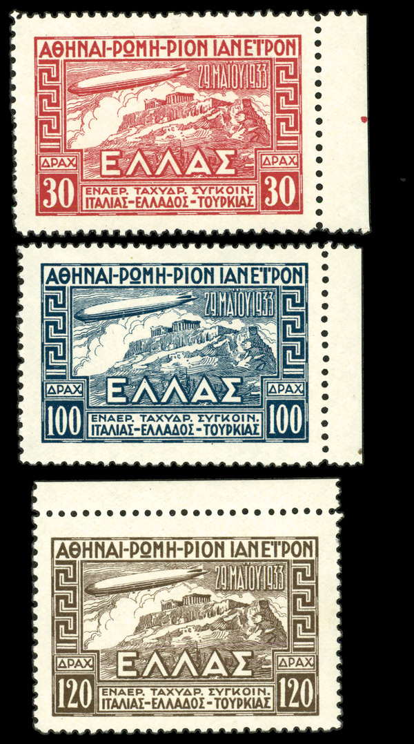 7763 og C5-C7 imageAirmail, 1933, Graf Zeppelin complete (Scott C5-C7), set of 3, complete set of marginal singles, o.g., hinged, Fine to Very Fine.