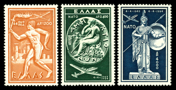 7765 nh C71-C73 imageAirmail, 1954, N.A.T.O. complete (Scott C71-C73), set of 3, complete set of singles, o.g., never hinged, Fine to Very Fine.