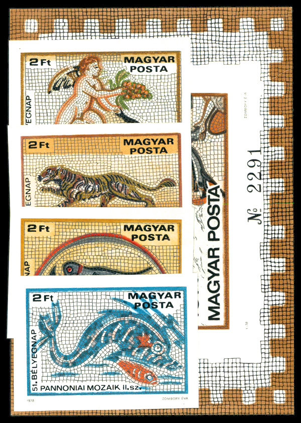 7787 nh 2542-2546 image1978, Roman Mosaics Found in Hungary, complete imperf singles and Souvenir (Scott 2542-2546), o.g., never hinged, Fine to Very Fine.