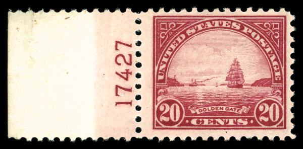 7093 nh 567 image1923, 20¢ Golden Gate (Scott 567), plate number single, o.g., never hinged, Fine to Very Fine.