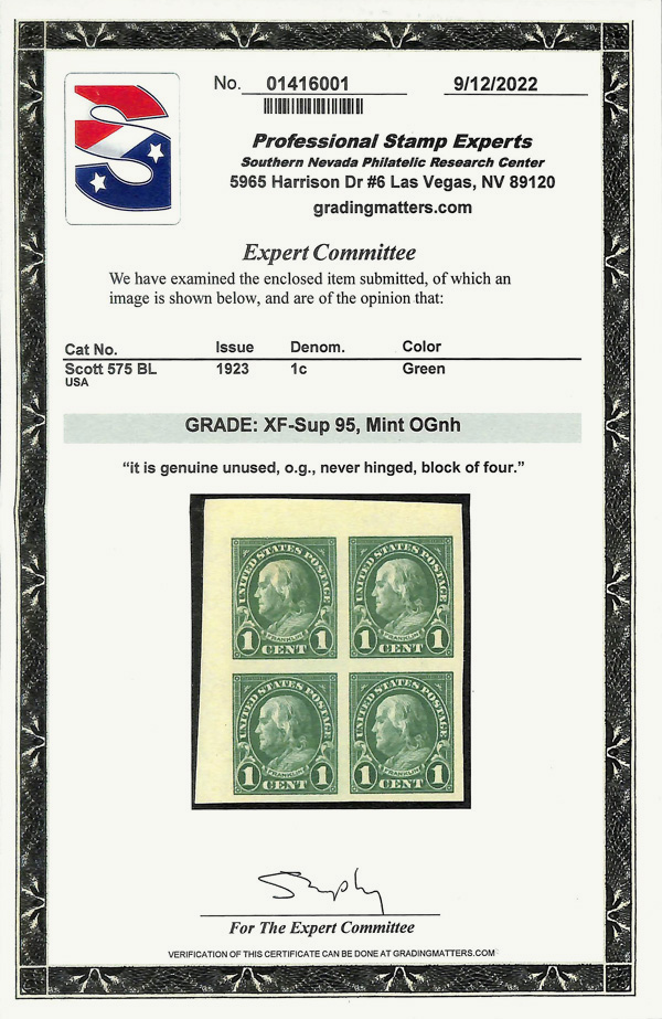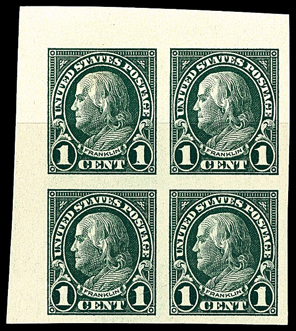 7097 nhbl 575 image1923, 1¢ Franklin, imperf. (Scott 575), corner margin block of 4, o.g., never hinged, Extremely Fine to Superb, with 2022 P.S.E. certificate graded XF-SUP 95.
