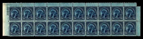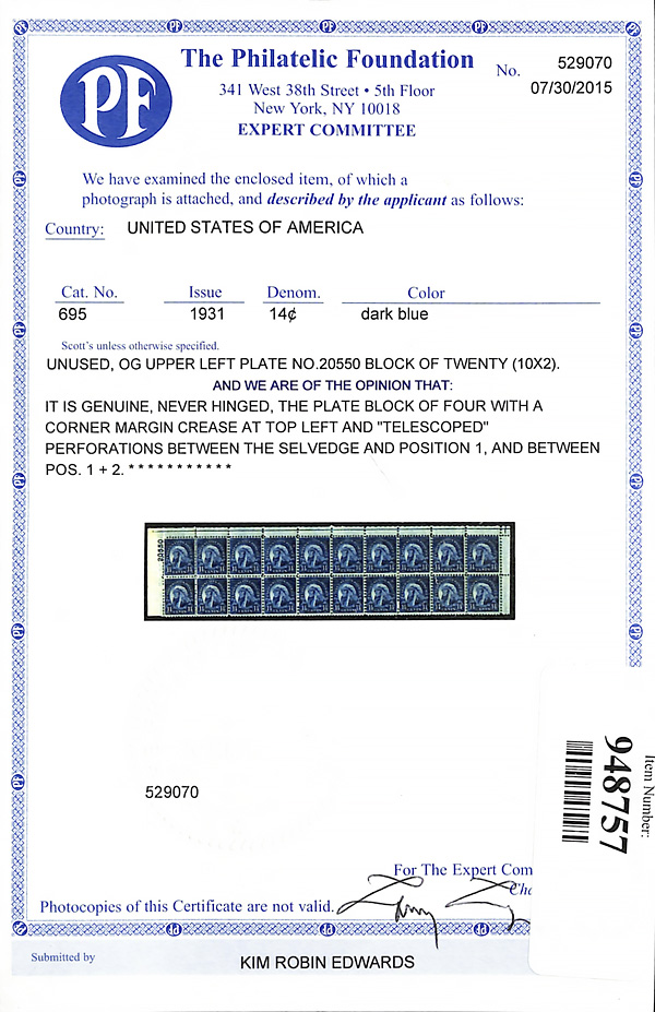 7113 nhbl 695 image1931, 14¢ American Indian, rotary press printing (Scott 695), top left plate block of 20 (separations, weak perfs & selvage crease at PB), o.g., never hinged, Fine to Very Fine, with 2015 P.F. certificate.