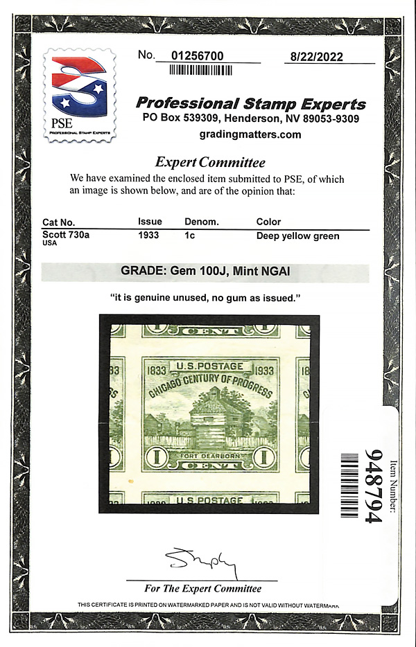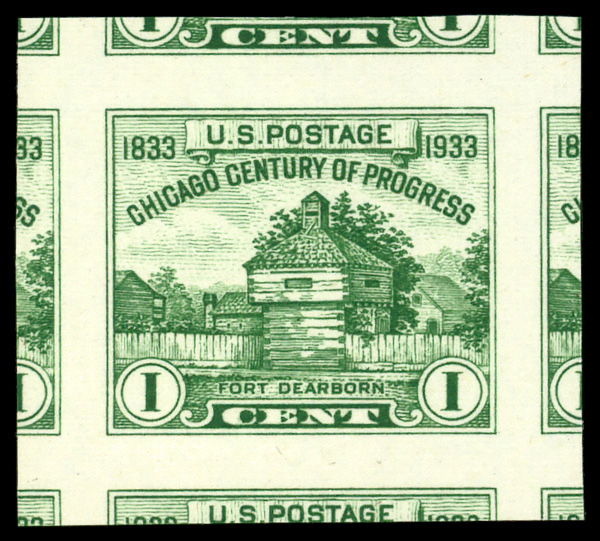7117 ng 730a image1933, 1¢ A.P.S., single from souvenir sheet (Scott 730a), with parts of 8 adjacent stamps., without gum as issued, Superb no SMQ price for jumbo.