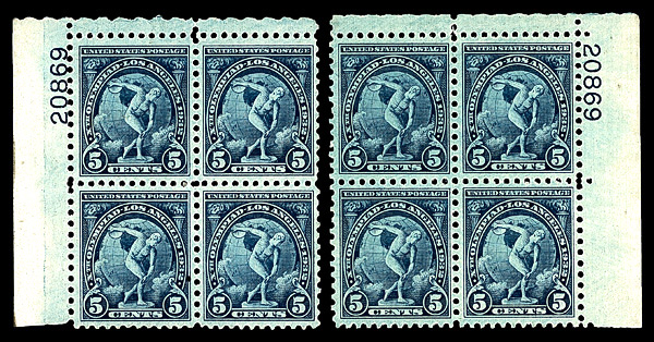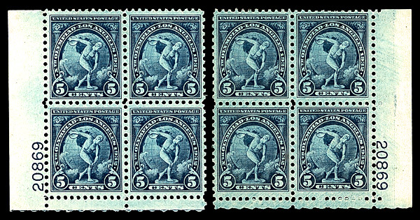 7115 nh/ogbl 719 image1932, 5¢ Summer Olympics (Scott 719), matched set of plate block of 4, o.g., lightly hinged (2 blocks never hinged), Very Fine to Extremely Fine.