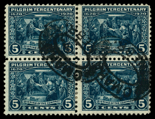 7087 Obl 550 image1920, 5¢ Pilgrim (Scott 550), block of 4, Fine to Very Fine.