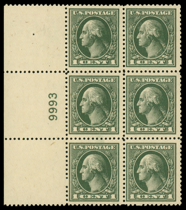 7084 nhbl 536 image1919, 1¢ gray green, offset printing, perf. 12½ (Scott 536), left margin plate block of 6, o.g., never hinged, very fresh appearance; small spot of gum disturbance on center right stamp, Very Fine.