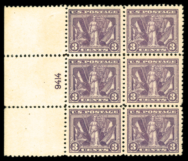 7085 nh/ogbl 537 image1919, 3¢ Victory (Scott 537), left margin plate block of 6, o.g., bottom four stamps never hinged / top stamps have hinge remnants; light gum wrinkle on right center stamp, Very Fine.